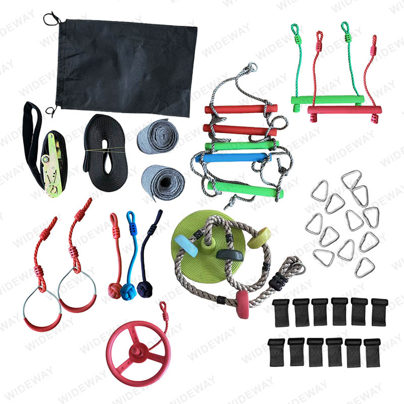 మా స్లాక్లైన్ స్వింగ్ సెట్తో బహిరంగ సాహసాలను తదుపరి స్థాయికి తీసుకెళ్లండి - బలం, చురుకుదనం మరియు సమన్వయాన్ని పెంచడానికి రూపొందించిన డైనమిక్ స్లాక్లైన్ కిట్. రాట్చెట్తో 15 మీటర్ల స్లాక్లైన్ను కలిగి ఉన్న ఈ ఆల్-ఇన్-వన్ సెట్ పిల్లలను చురుకుగా మరియు నిశ్చితార్థం చేసుకునేటప్పుడు అడ్డంకులను ఎక్కడానికి, స్వింగ్ చేయడానికి మరియు జయించటానికి అధికారం ఇస్తుంది. 2 పిసిఎస్ ట్రాపెజీ బార్లు, 2 పిసిఎస్ జిమ్నాస్టిక్ రింగులు, క్లైంబింగ్ నిచ్చెన మరియు తిరిగే నింజా వీల్ వంటి సర్దుబాటు చేయగల జోడింపులతో, పిల్లలు తమ సొంత నింజా ఛాలెంజ్ కోర్సును అనుకూలీకరించవచ్చు. మన్నికైన పాలిస్టర్ వెబ్బింగ్తో నిర్మించబడిన, పిల్లల కోసం ఈ నింజా వారియర్ అడ్డంకి కోర్సు పెరటి ఆట, పార్కులు లేదా కుటుంబ క్యాంపింగ్ పర్యటనలకు సరైనది.