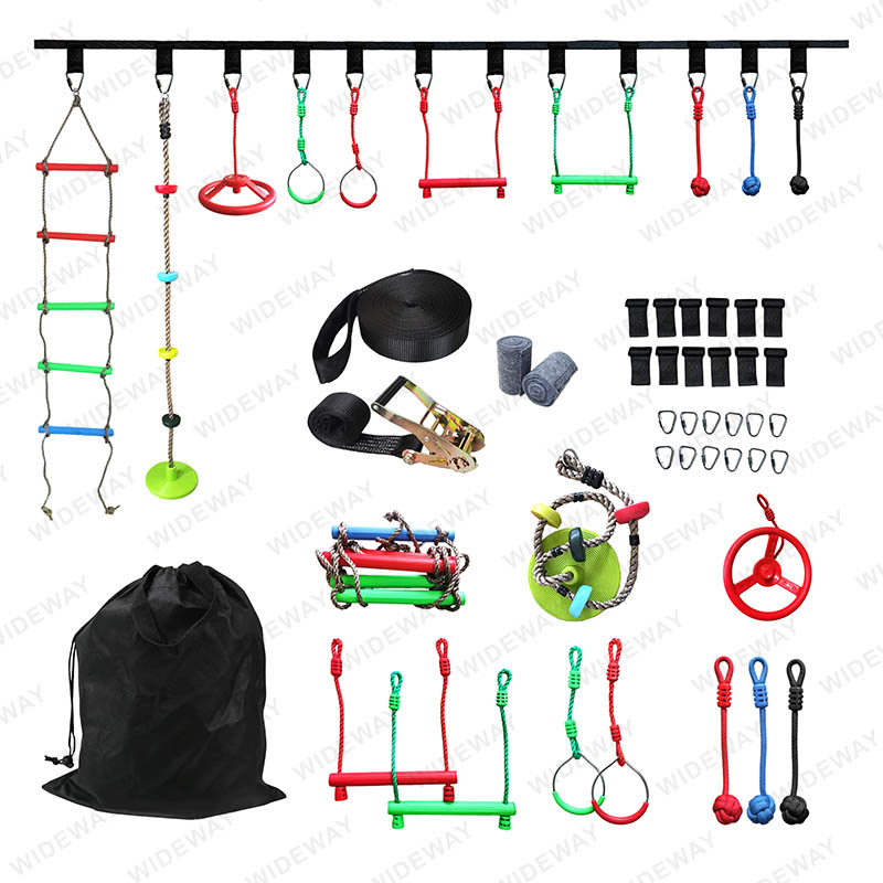 N 2pcs ట్రాపెజీ బార్లు, 2 పిసిఎస్ జిమ్నాస్టిక్ రింగులు, క్లైంబింగ్ నిచ్చెన మరియు విభిన్న నింజా శిక్షణ అనుభవం కోసం నింజా వీల్ను తిప్పడం.